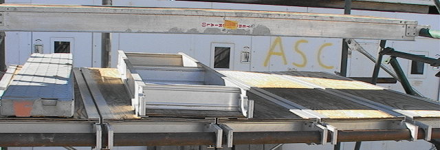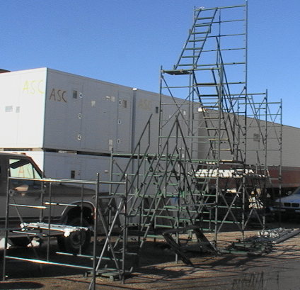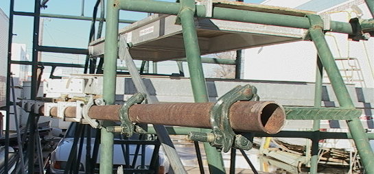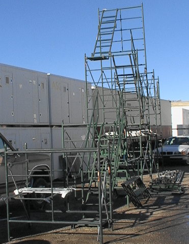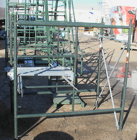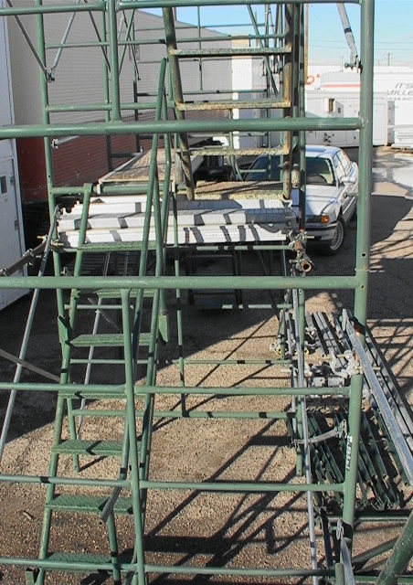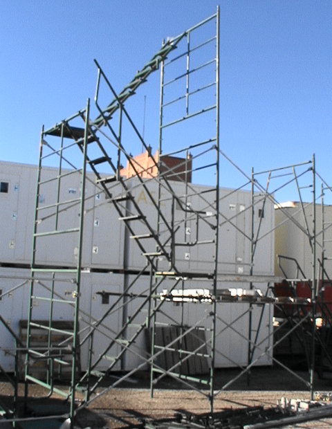 planking external to the scaffold frame for walkway or work decking.