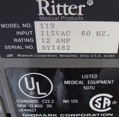 the height of the chair. Ritter Medical Products Model 119. A 115 VAC